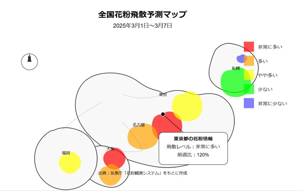 この花粉の飛散状況は、天気予報アプリなどでも簡単に確認できるようになりました。(出典:気象庁「花粉観測システム」)